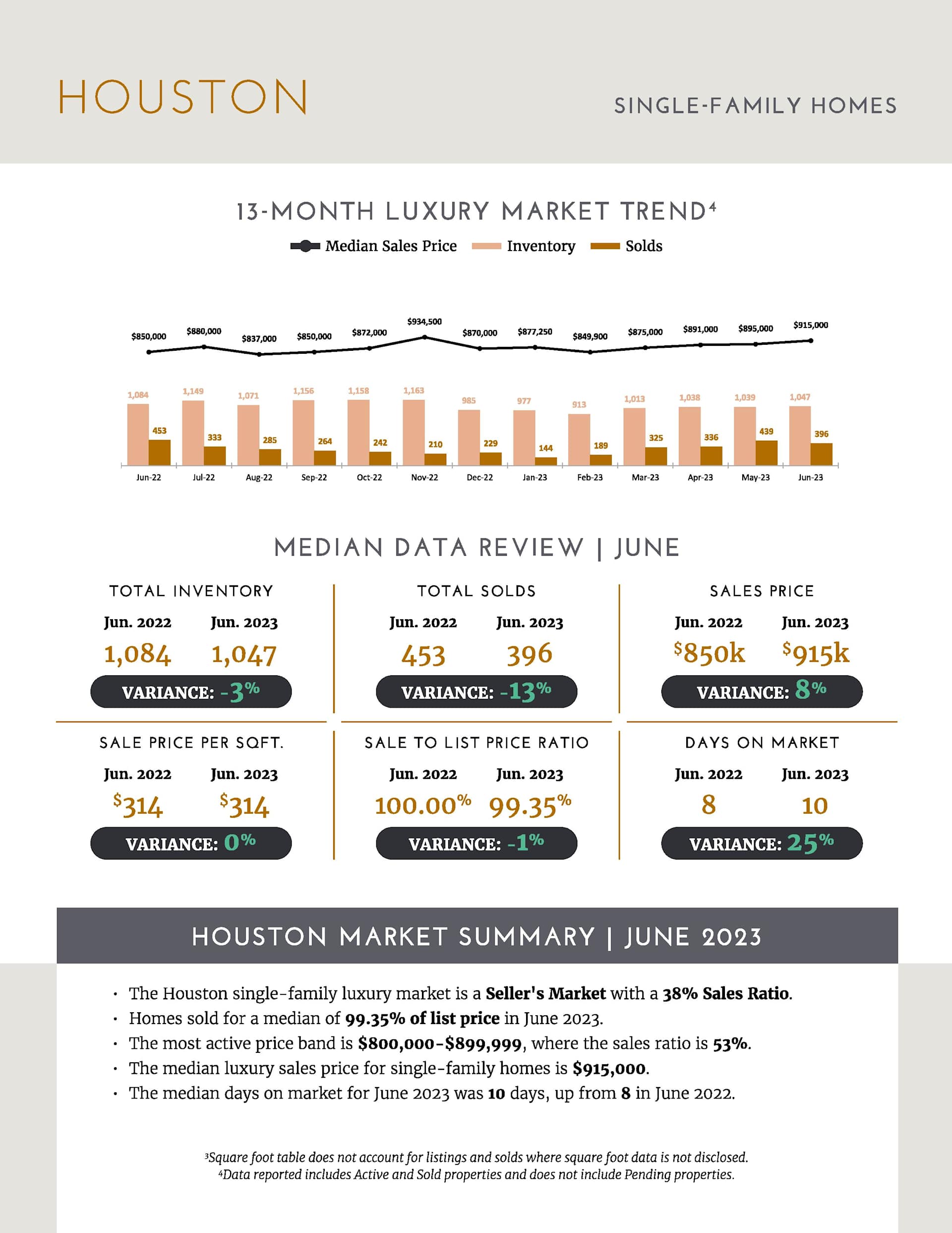 Houston continues to reflect that it's a seller's market entering into the third quarter. I wanted to share with you the July 2023 Luxury Market Report from The Institute for Luxury Home Marketing.